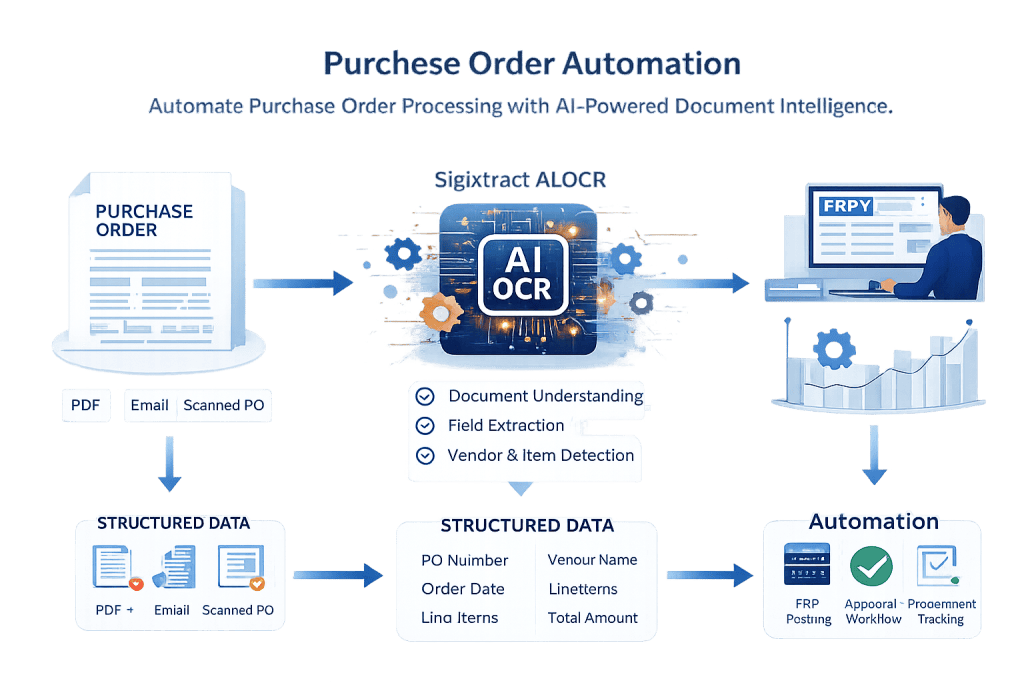 Sigixtract uses AI, Machine Learning, and OCR to intelligently capture purchase order details, validate extracted information, and convert unstructured PO documents into structured business data for seamless ERP integration.